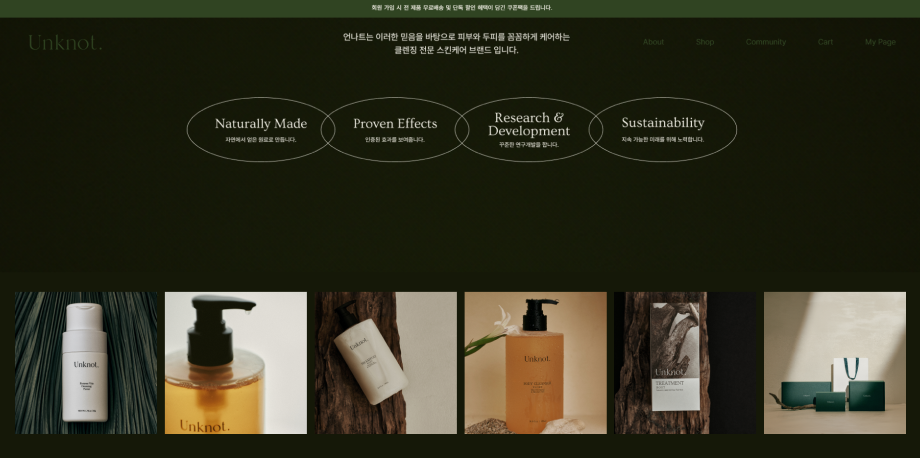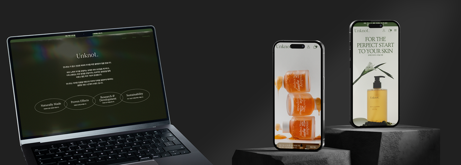 UNKNOT는 전체적으로 차분하며 정된되어 있는 느낌과 자연친화적인 느낌으로 디자인으로 구상하였습니다.